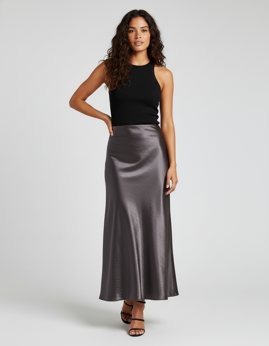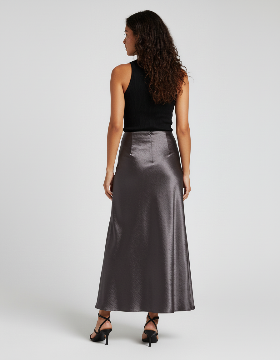 Ce qui distingue notre jupe ? Son satin haut de gamme, choisi pour son tombé impeccable et sa capacité à refléter la lumière, créant un jeu d'ombres et de reflets unique à chaque mouvement. Sa teinte grise intemporelle se marie aisément avec toute votre garde-robe, offrant une toile de fond parfaite pour exprimer votre personnalité. Facile à styliser avec un pull douillet ou un top en soie, elle incarne un chic contemporain, concret et résolument luxueux. Une pièce essentielle qui transforme chaque tenue en une déclaration de style raffinée.