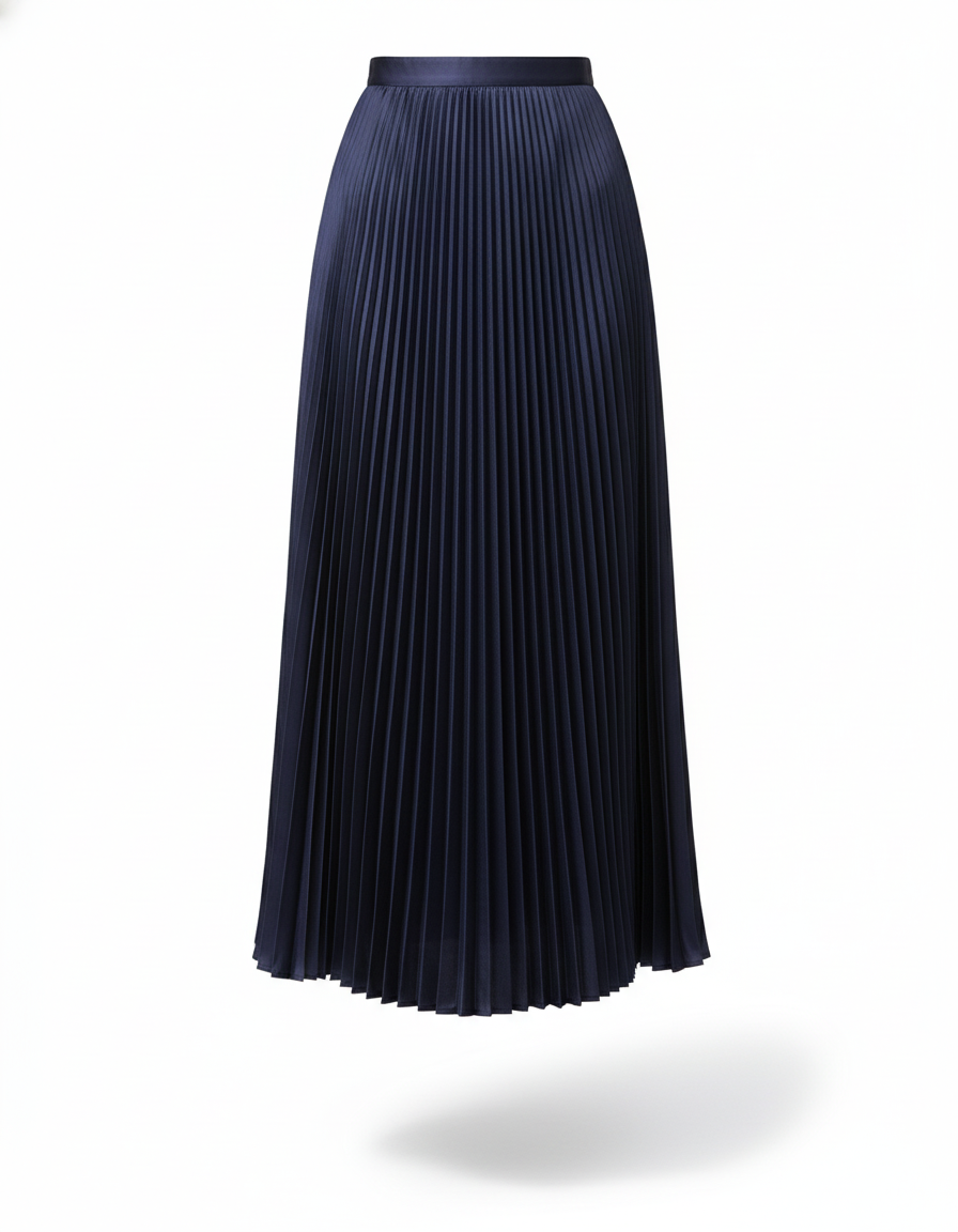 Élégante et intemporelle, cette jupe plissée bleu marine en satin est parfaite pour une allure raffinée.
