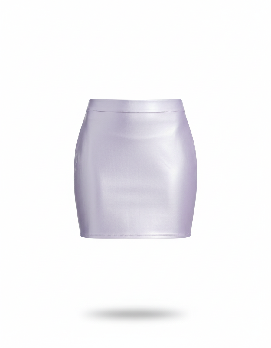 La jupe est un vêtement court et ajusté, confectionné dans un mélange de nylon et de spandex. Elle présente une surface brillante de couleur lilas, se terminant au-dessus du genou.