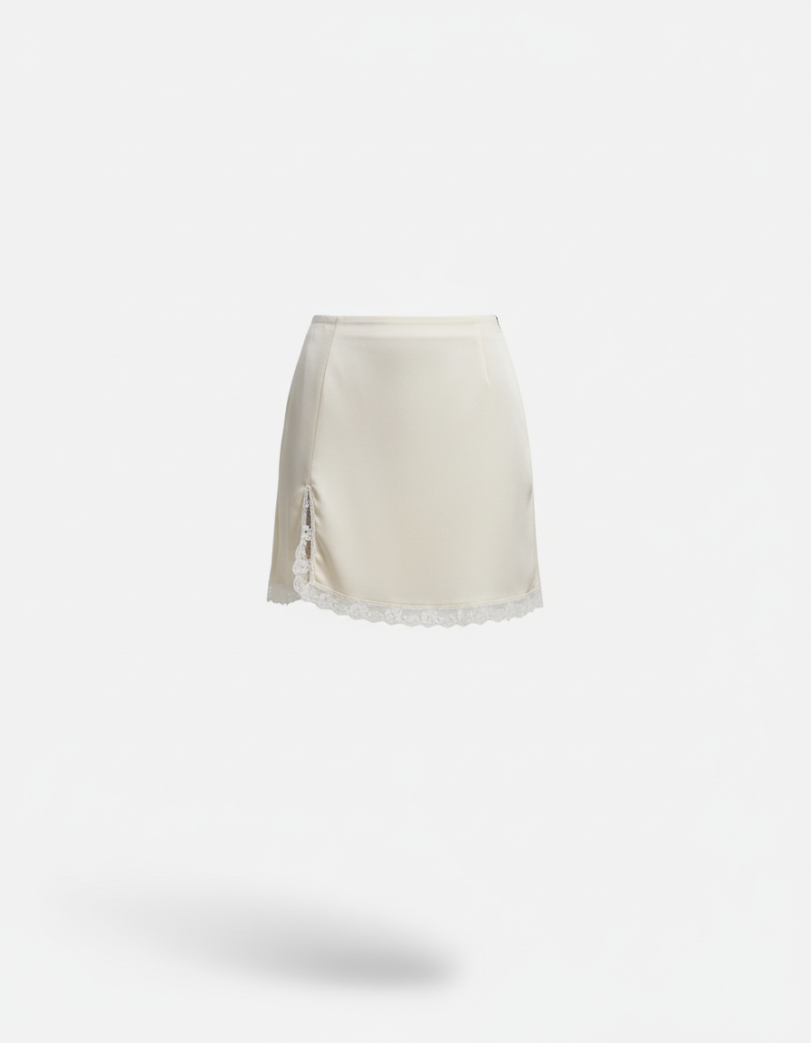 Jupe Satin Soie Moulante Mini avec Dentelle