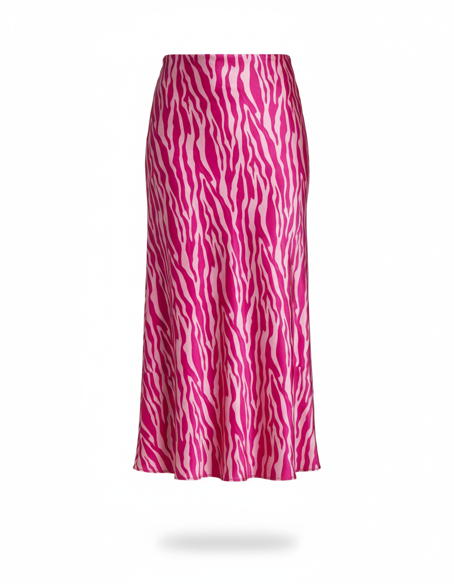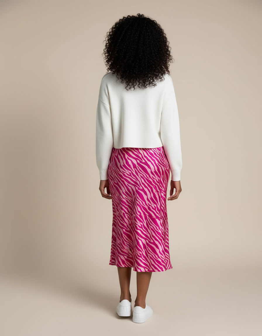 La Jupe Satin Tigre, avec son motif zébré rose vif et sa coupe évasée contemporaine, est une pièce maîtresse pensée pour sublimer toutes vos sorties. Pour un look décontracté-chic en journée, associez-la à un pull en maille fine et des baskets immaculées, comme présenté, idéal pour un brunch ou une virée urbaine. Le soir venu, transformez votre allure en un clin d'œil : un top en soie uni, des talons aiguilles et des accessoires discrets suffiront à créer une élégance audacieuse et irrésistible.