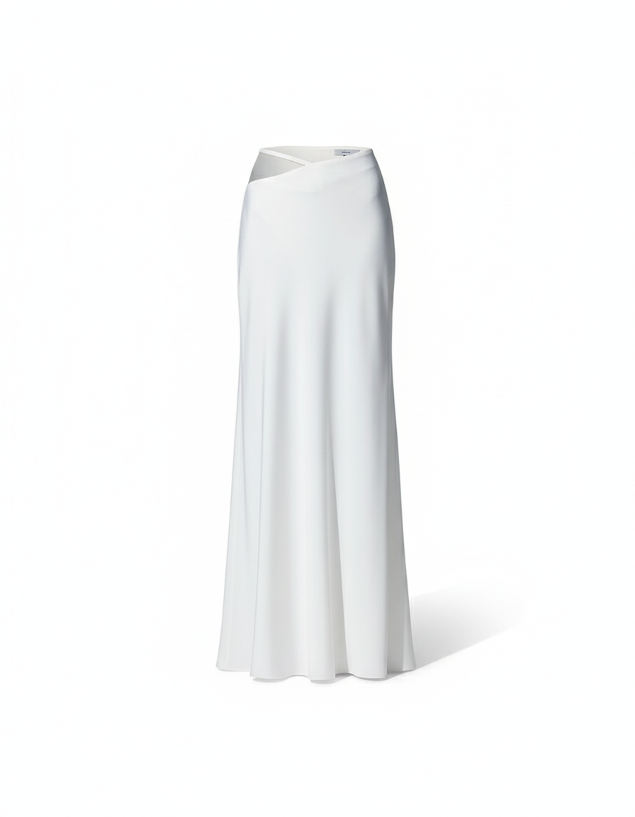 Cette jupe présente une coupe longue et droite. Elle est confectionnée dans un tissu satiné de couleur blanche.